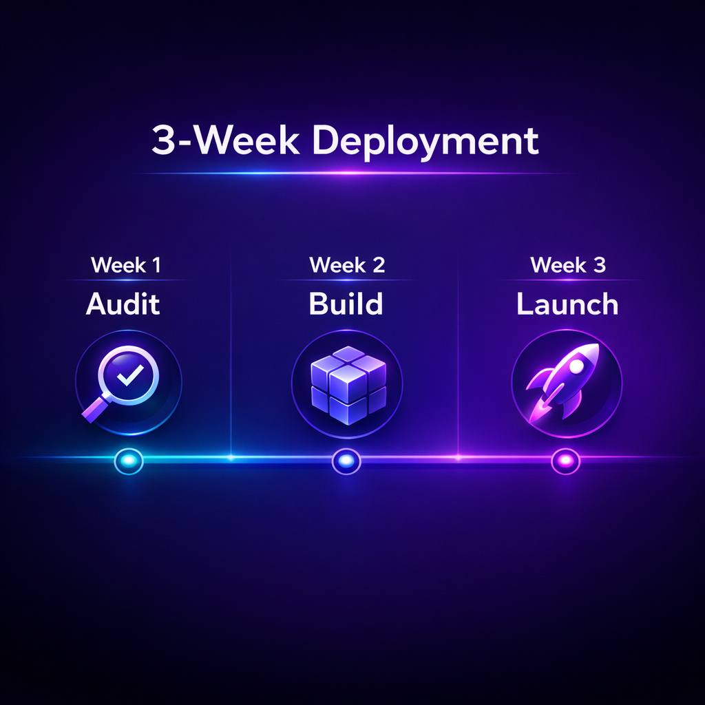 - Week 3 — Launch + Handoff: Go live. Owner team receives dashboard access and escalation protocols.