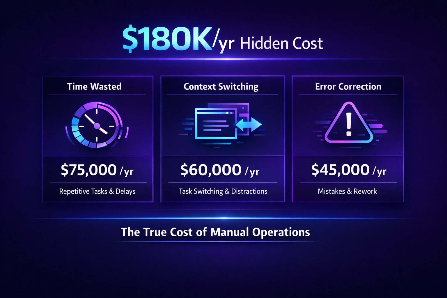 This language speaks to the CFO, the COO, and the founder. It addresses the actual pain points: margin compression, hiring bottlenecks, and human error.