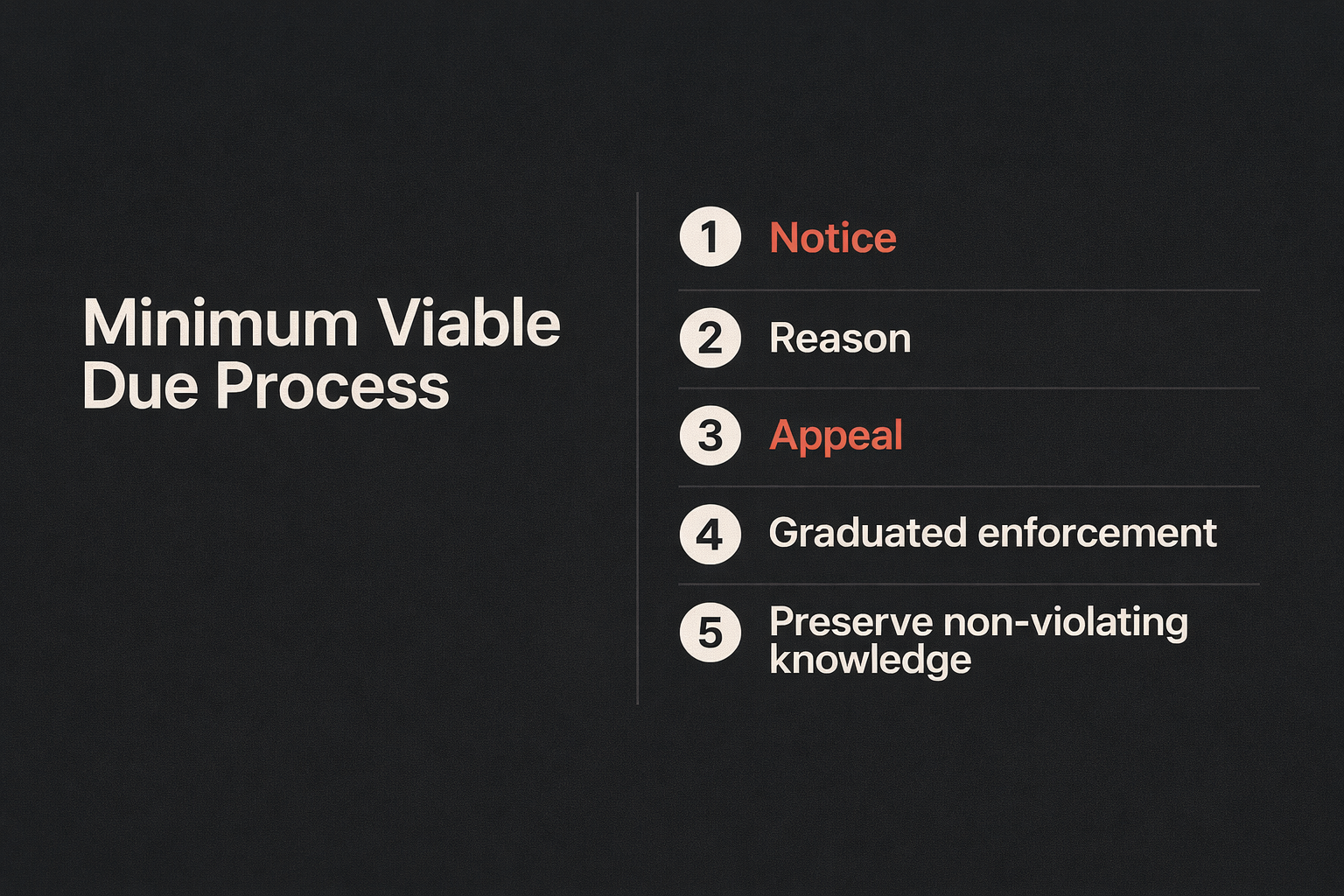 - Communities at scale need minimum due process: notice, reason, and a real appeals path.