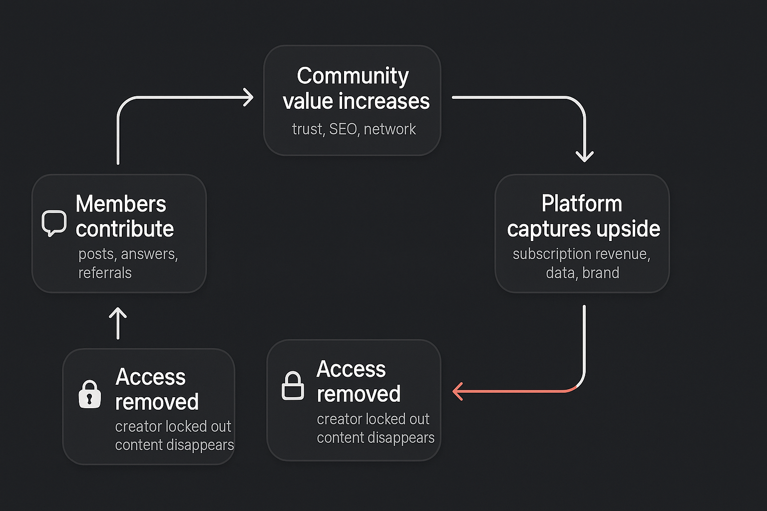 Figure 2: The community value loop: members contribute → value grows → platform captures upside → enforcement event → access removed.