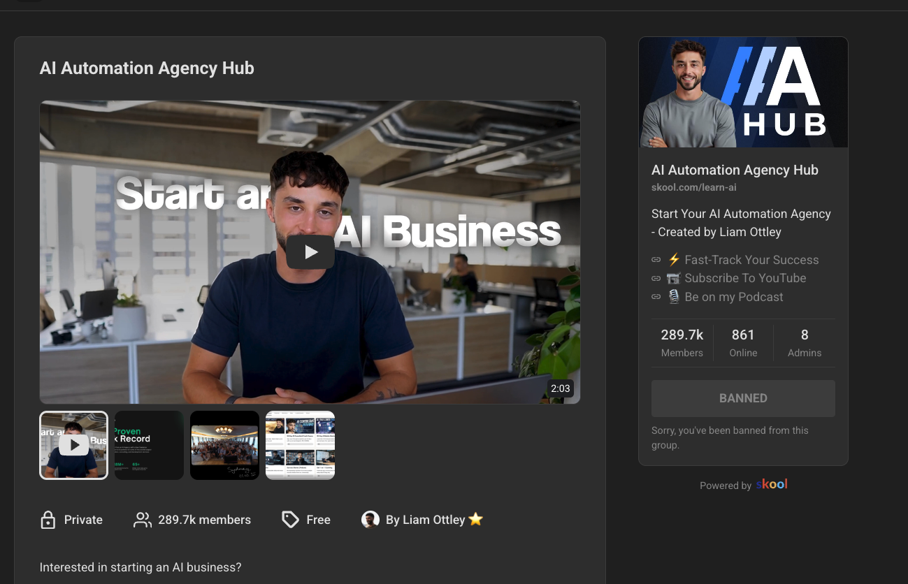 Figure 1: My account showing I’m banned from “AI Automation Agency Hub” on Skool.