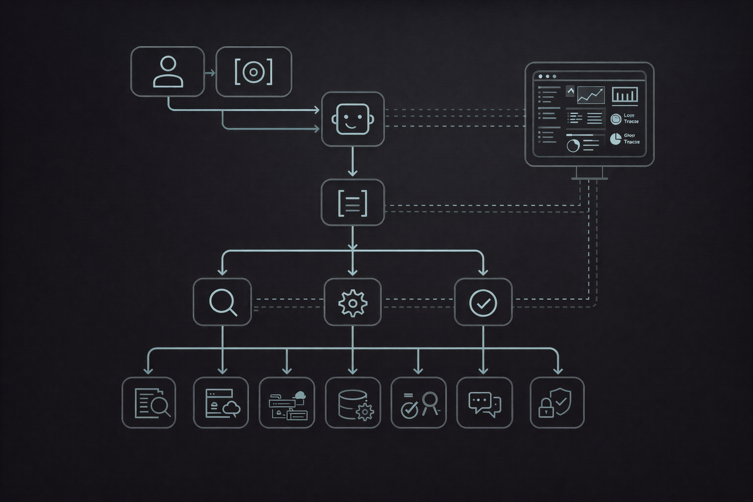 - Observability collects traces and metrics for debugging, evaluation, and governance.
