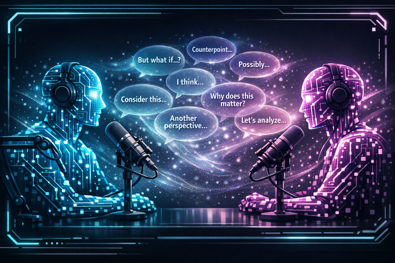 Two AI podcast hosts made of glowing circuits with a translucent layer of reasoning tokens between them